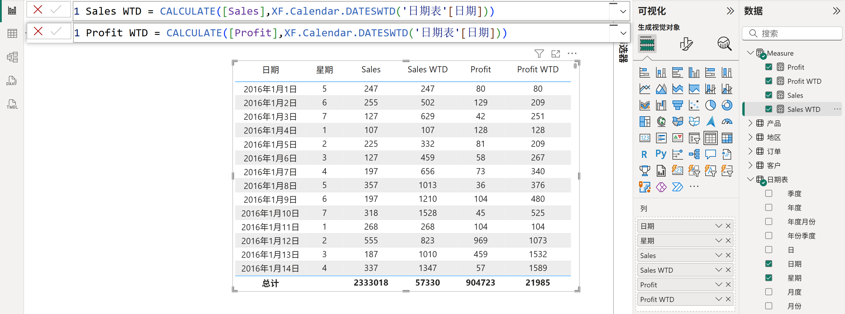 Sales WTD = CALCULATE([Sales],XF.Calendar.DATESWTD('日期表'[日期]))