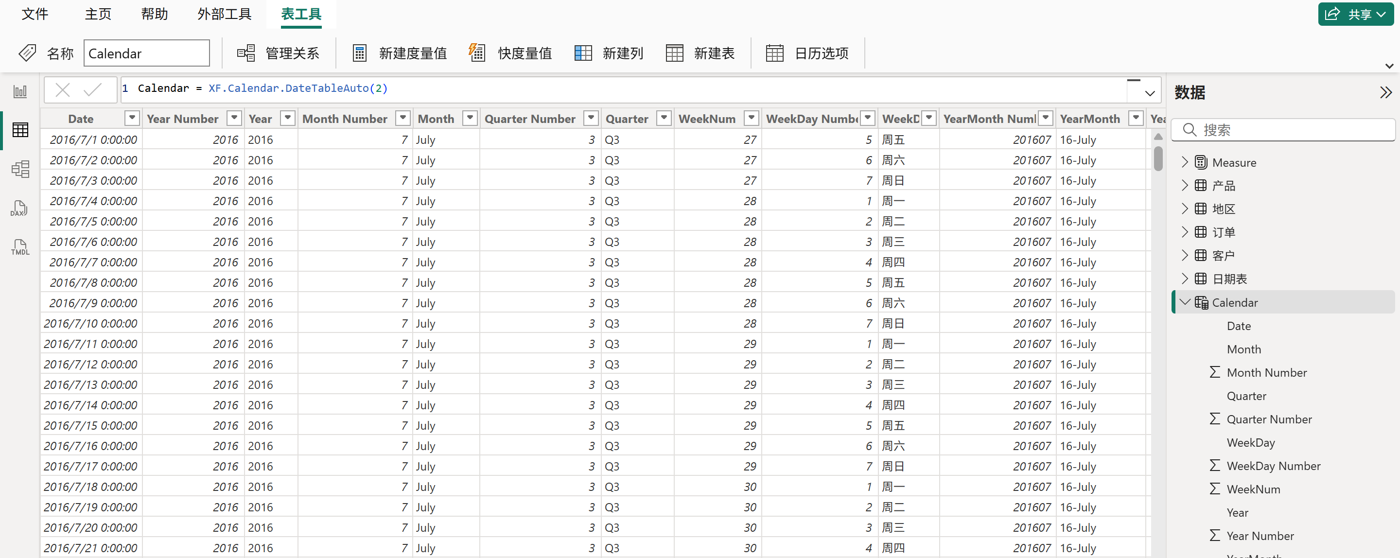 自动检测模型的日期字段,生成一张能覆盖所有日期的标准日期表;StartDayOfWeek参数用于指定每周的第一天,1:周日,2:周一。