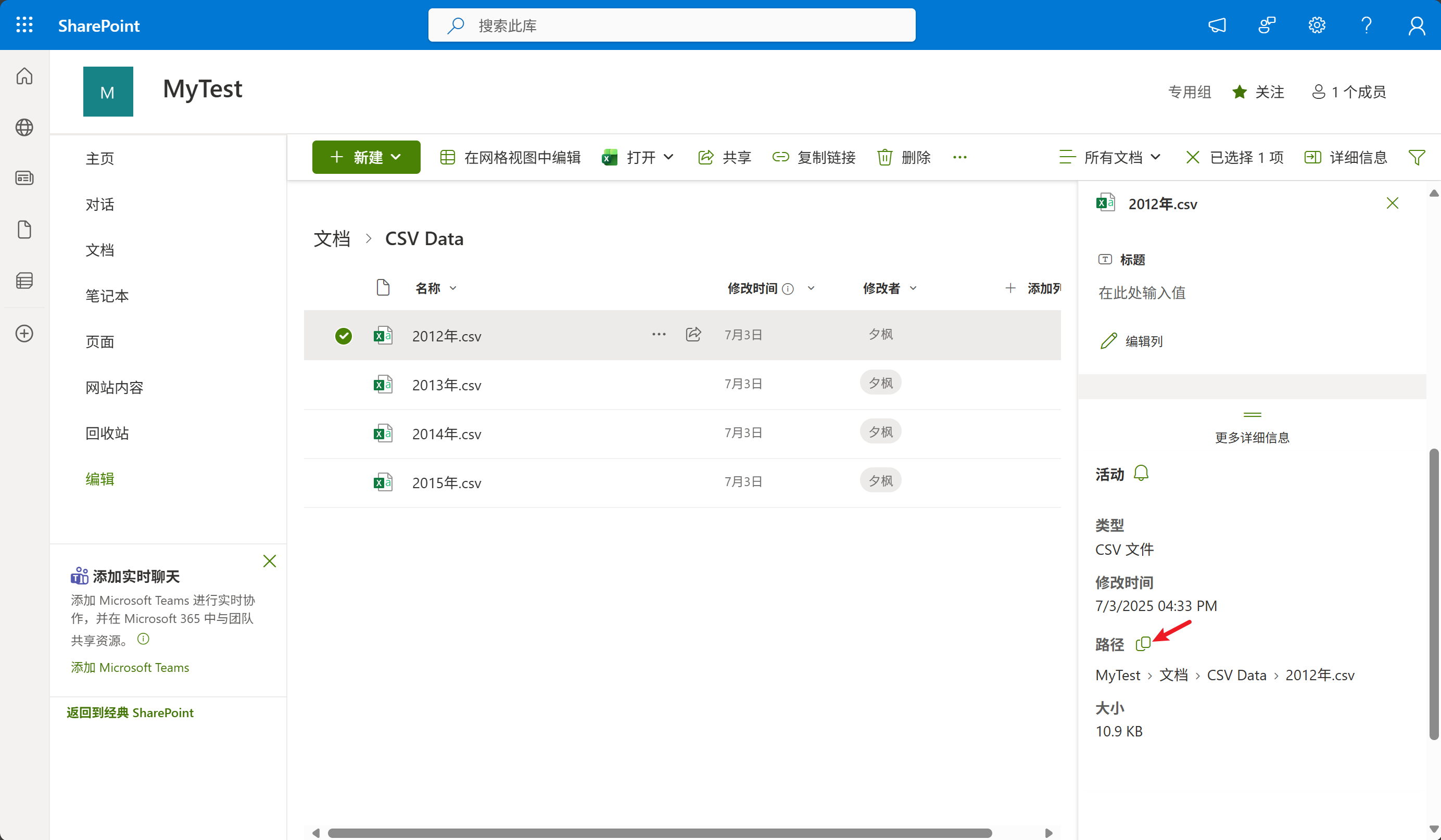 1、在SharePoint上找到对应CSV文件,查看其详细信息,然后点击路径隔壁的按钮即可获取到网络路径,如下图所示: