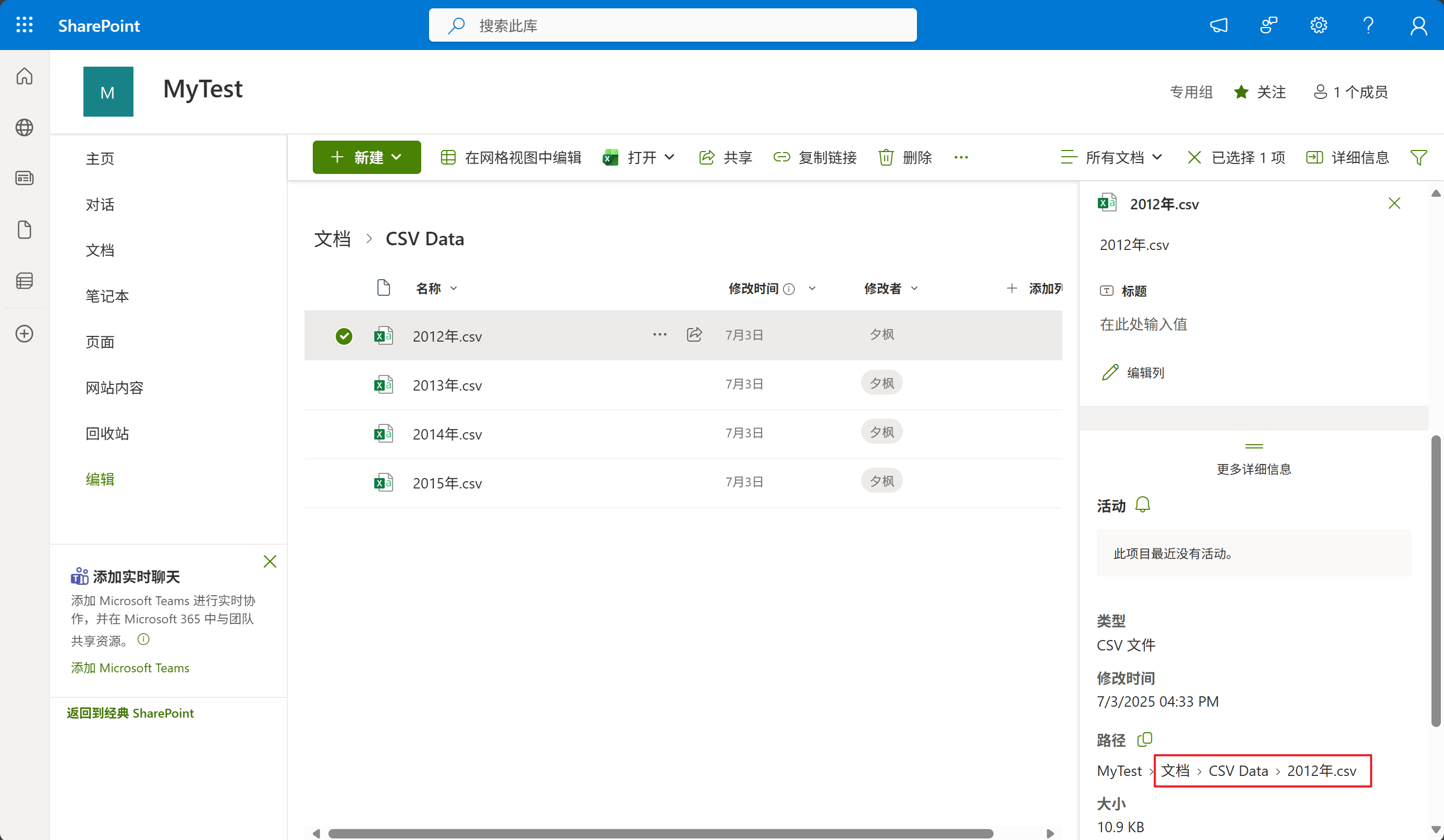 ,再把分隔符改为斜杠或反斜杠即可得到完整路径。如上图所示的CSV文件的完整路径应该为:Shared Documents/CSV Data/2012年.csv