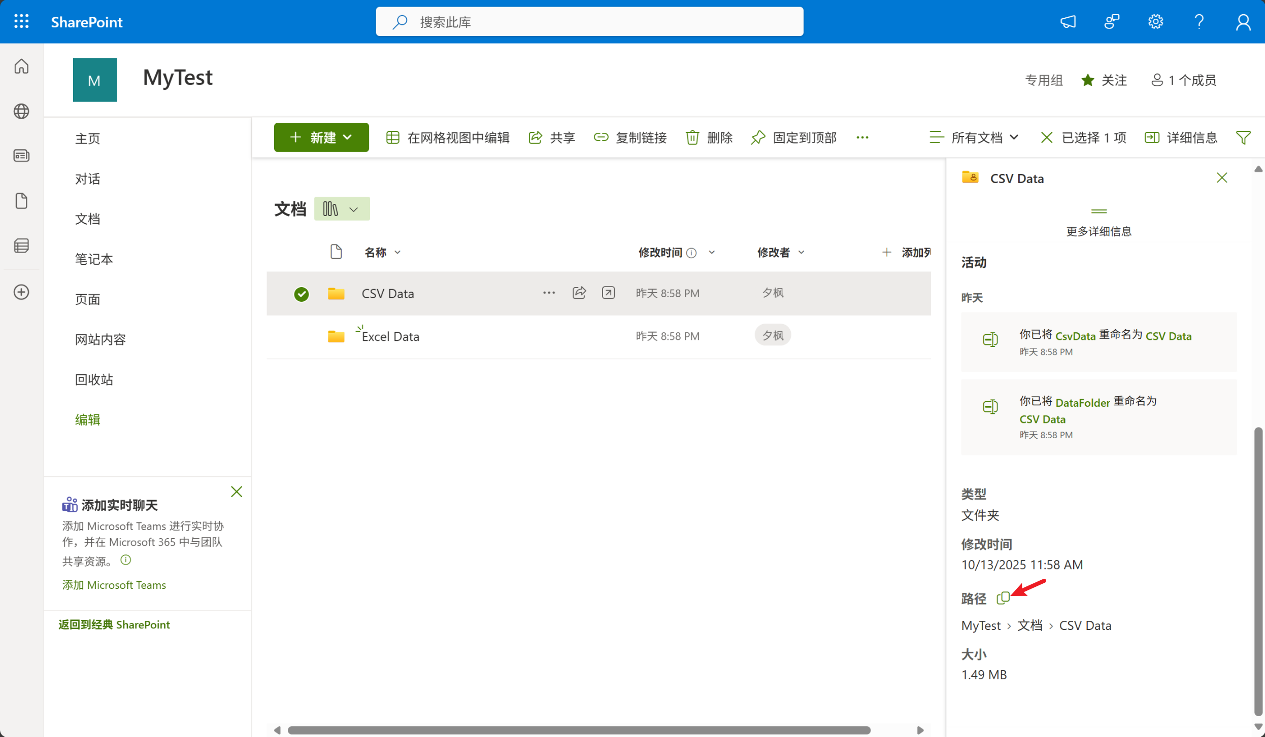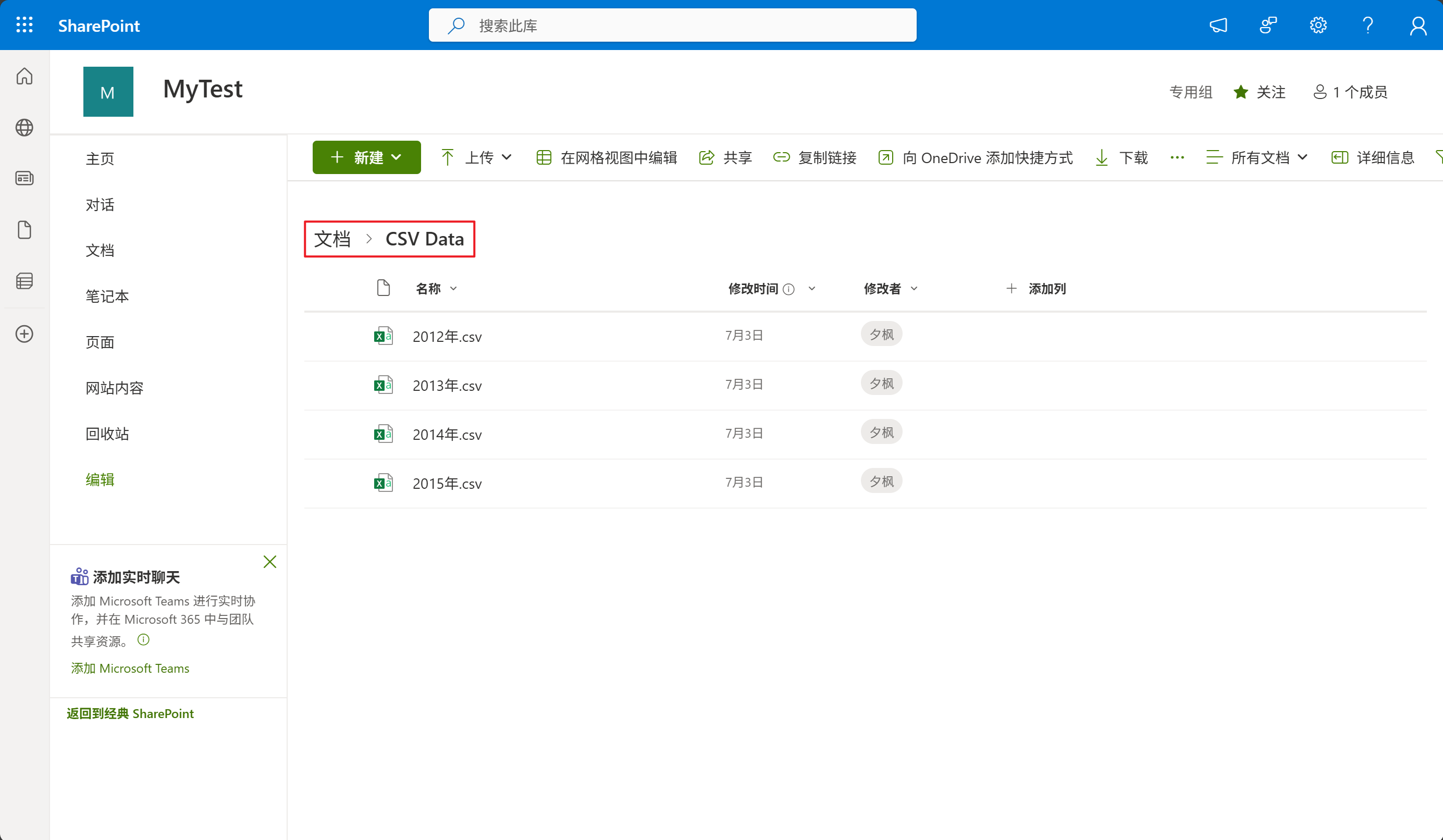 1、在SharePoint上找到对应CSV文件,然后从浏览器上方地址栏处截取CSV文件所在的SharePoint站点的链接,SharePoint站点链接的格式为:"https://TenantName.sharepoint.com/sites/SiteName"