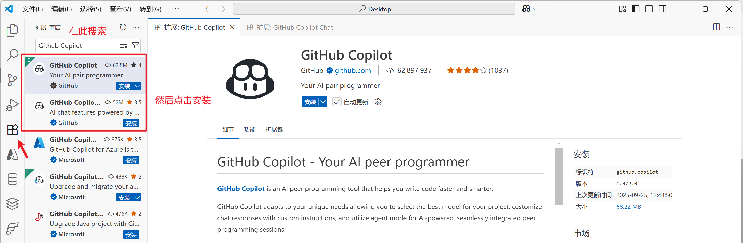 2、在Visual Studio Code中安装GitHub Copilot和GitHub Copilot Chat扩展,如下图所示: