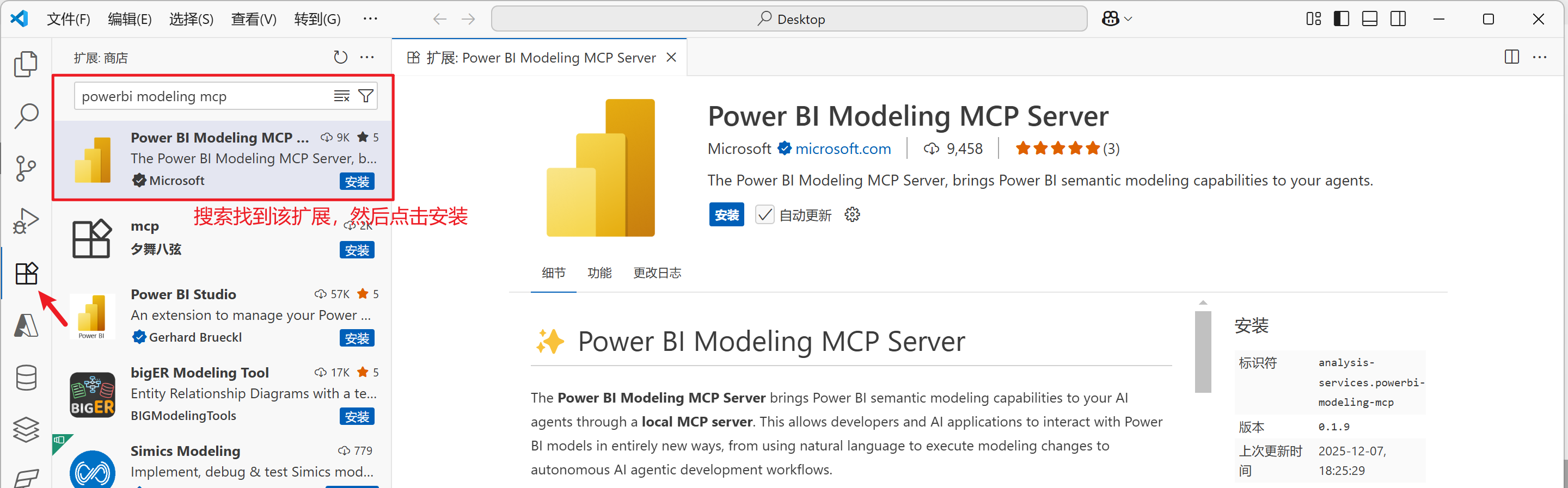 3、在Visual Studio Code中安装Power BI Modeling MCP扩展,如下图所示: