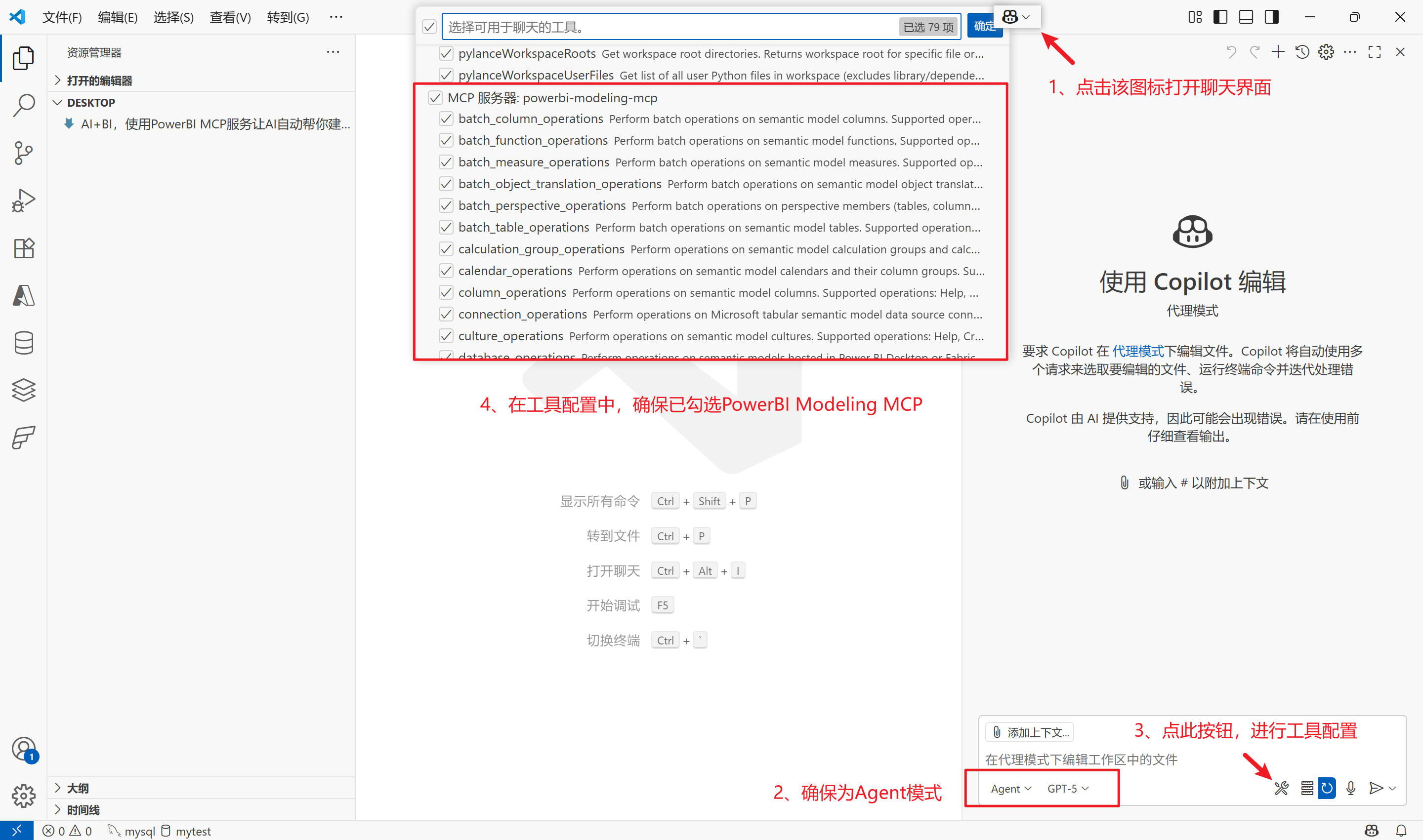 4、在Github Copilot的工具配置中勾选PowerBI Modeling MCP服务,如下图所示: