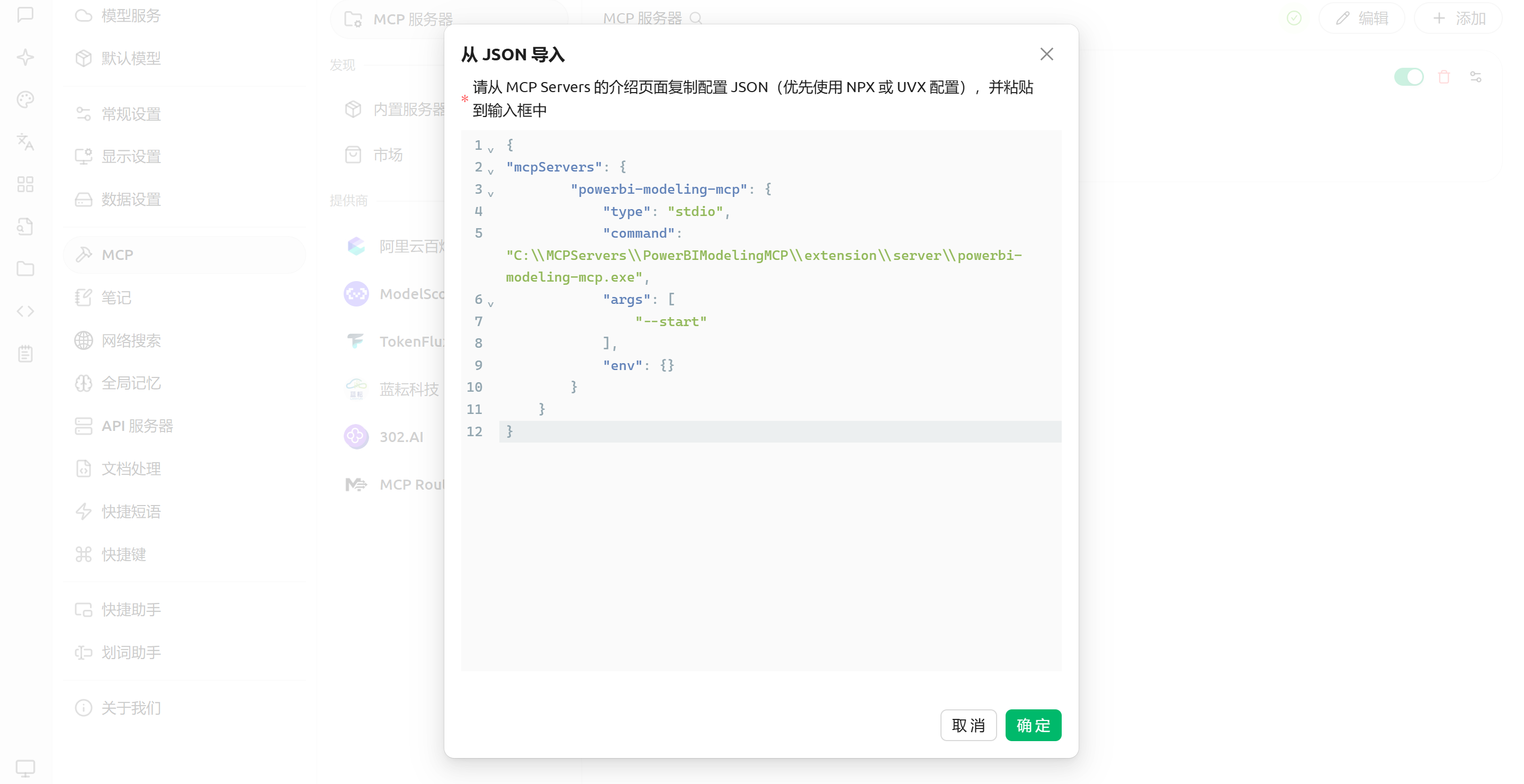 5、将JSON代码粘贴到支持MCP功能的AI工具中进行安装,如下图所示: