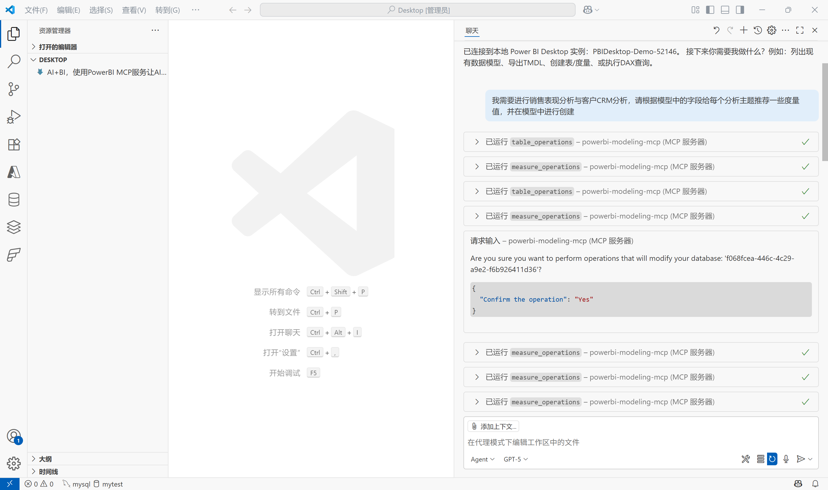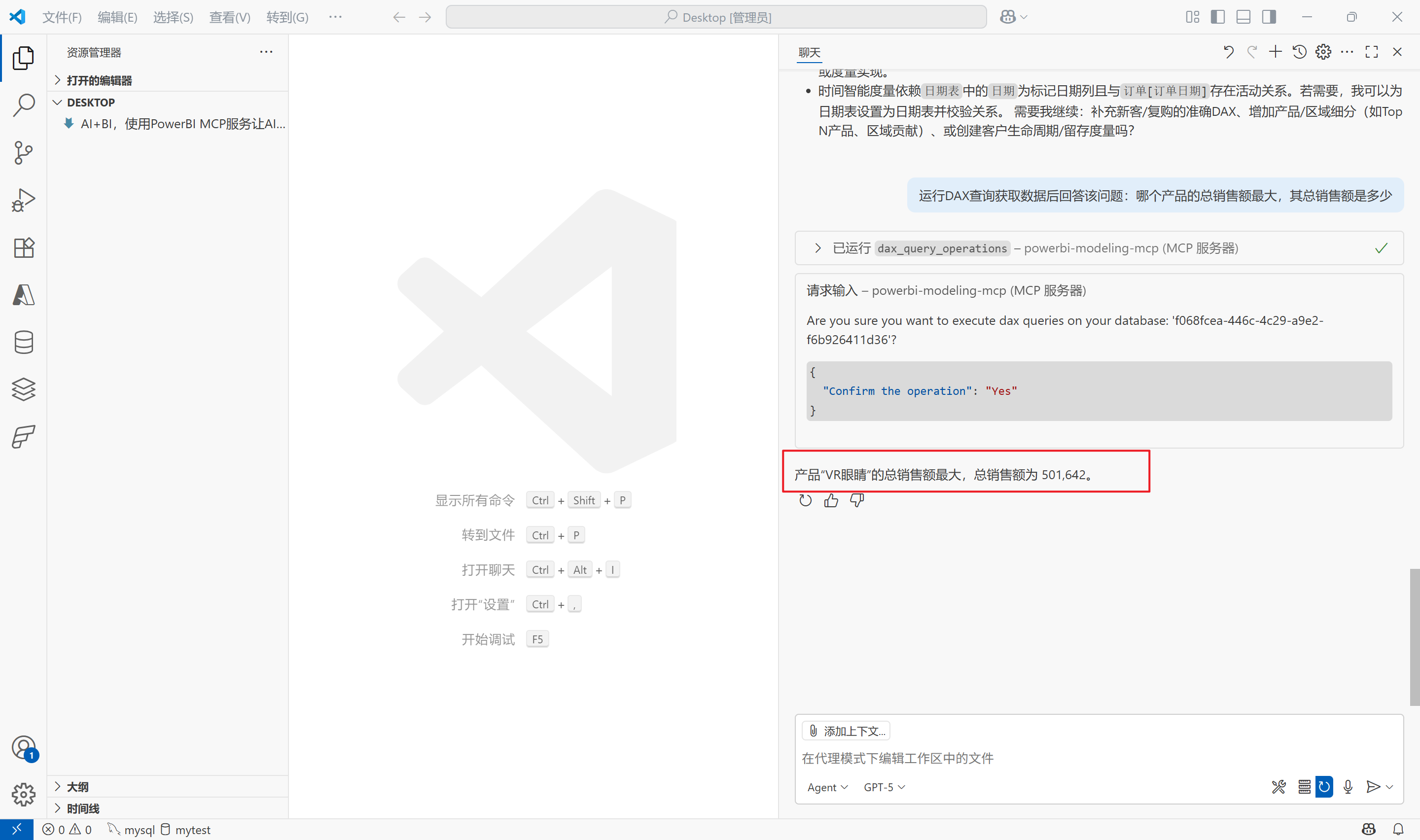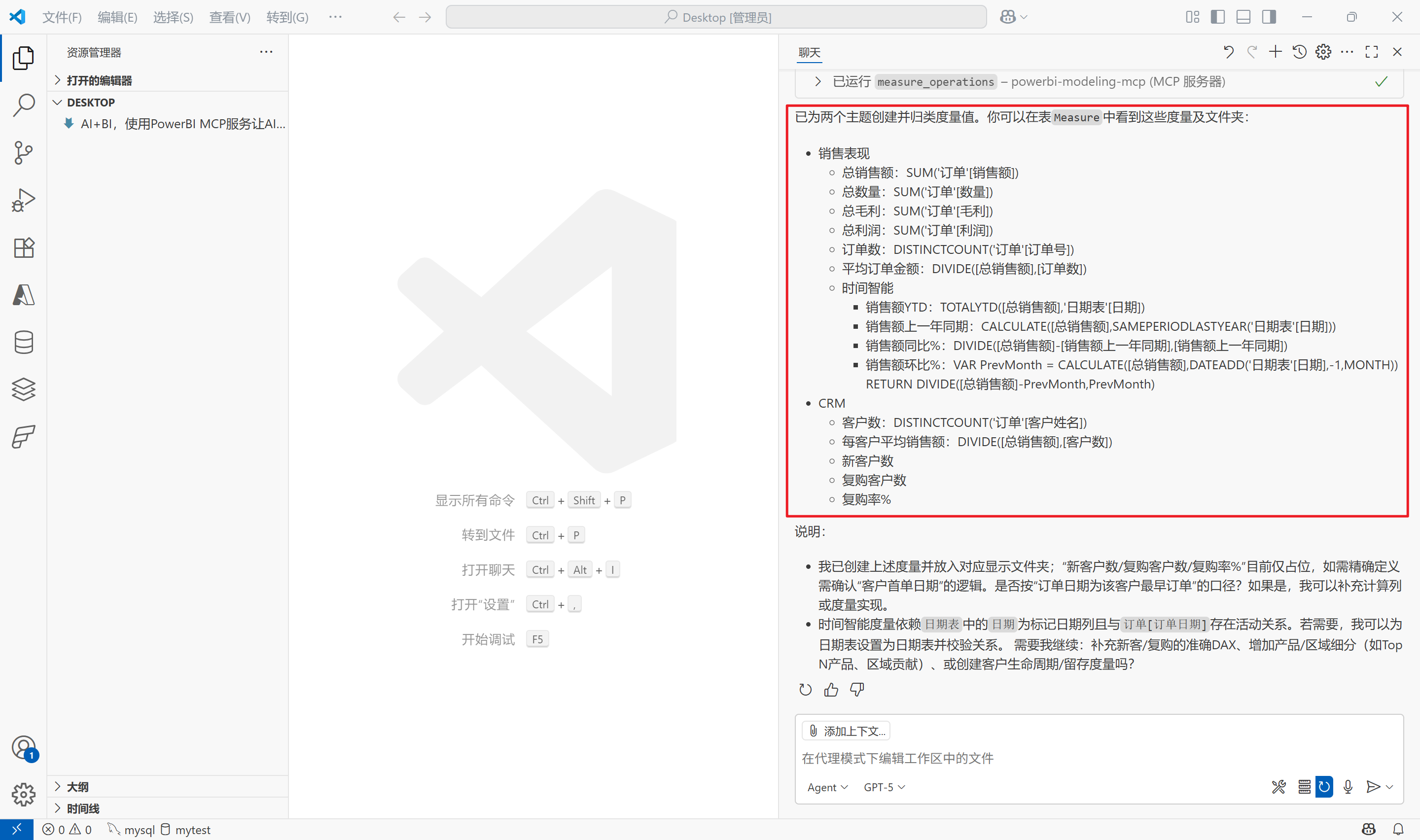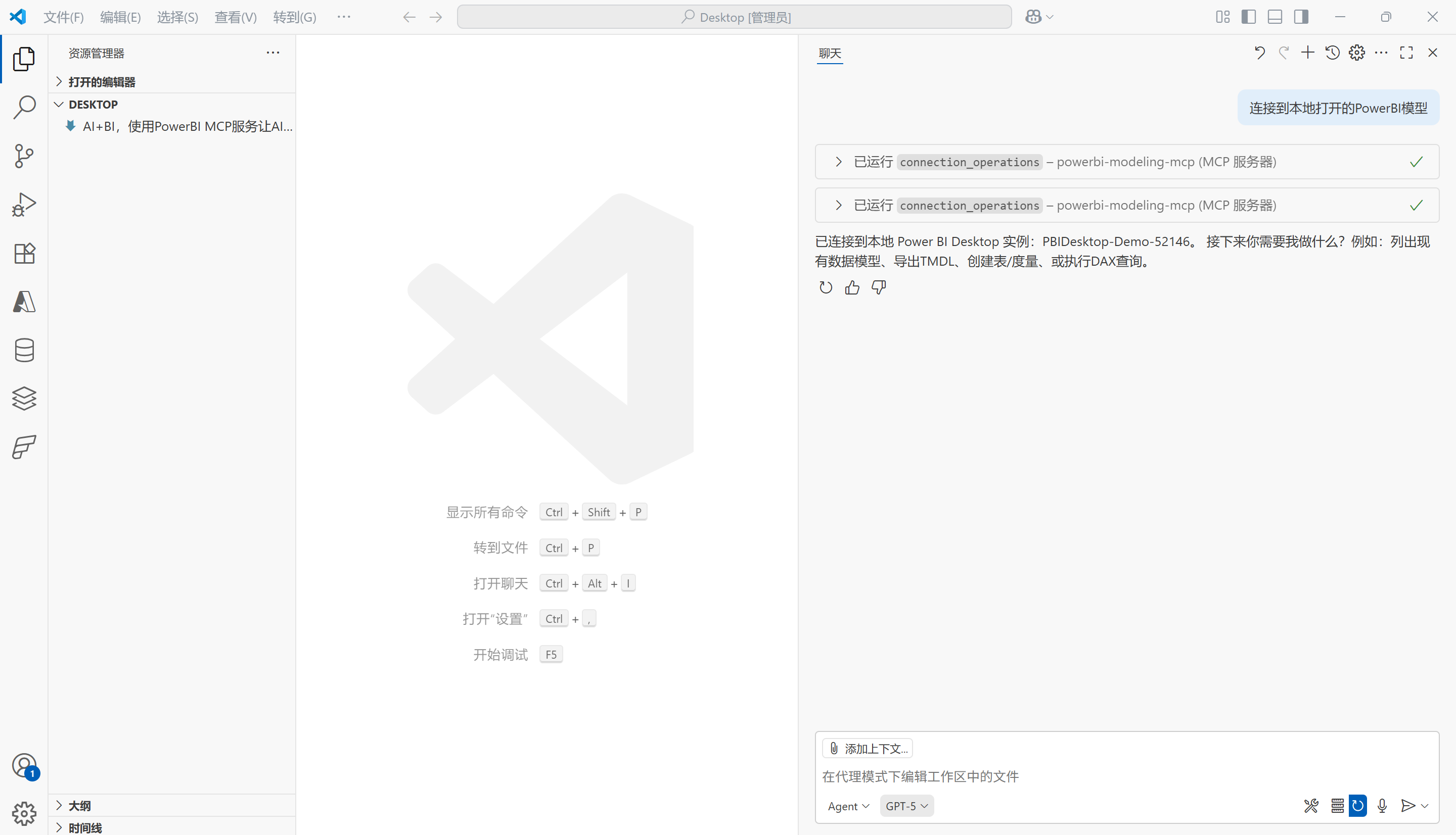 至此,PowerBI Modeling MCP服务已在Visual Studio Code中安装并配置完成,后续即可在Github Copilot的聊天框中让AI模型连接到PowerBI模型,然后让其回答问题或执行任务。