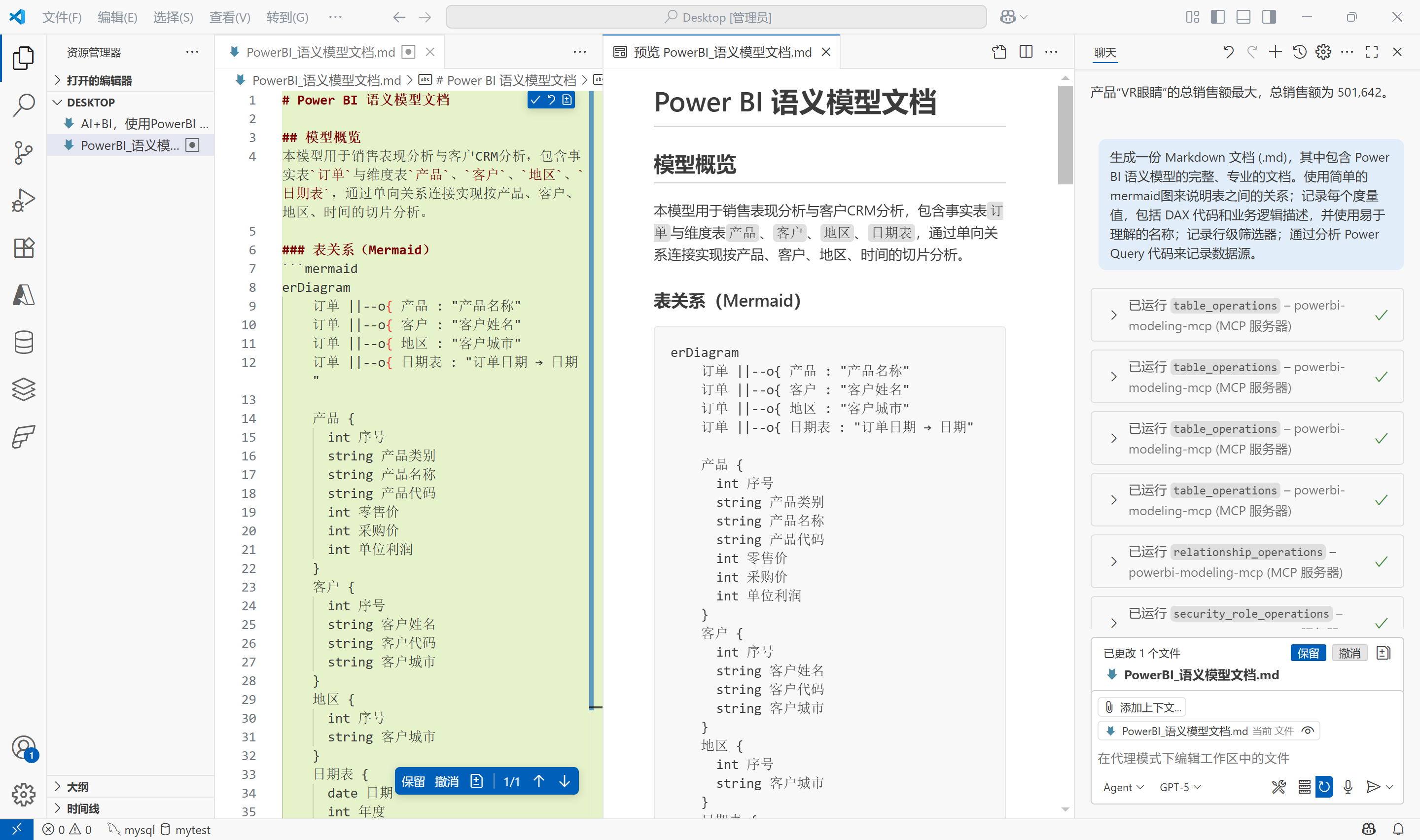 因此有了该PowerBI Modeling MCP服务后,就可以让AI模型来帮我们建模或干活,从而提升效率,比如让AI帮我们导出模型信息并撰写文档等等。