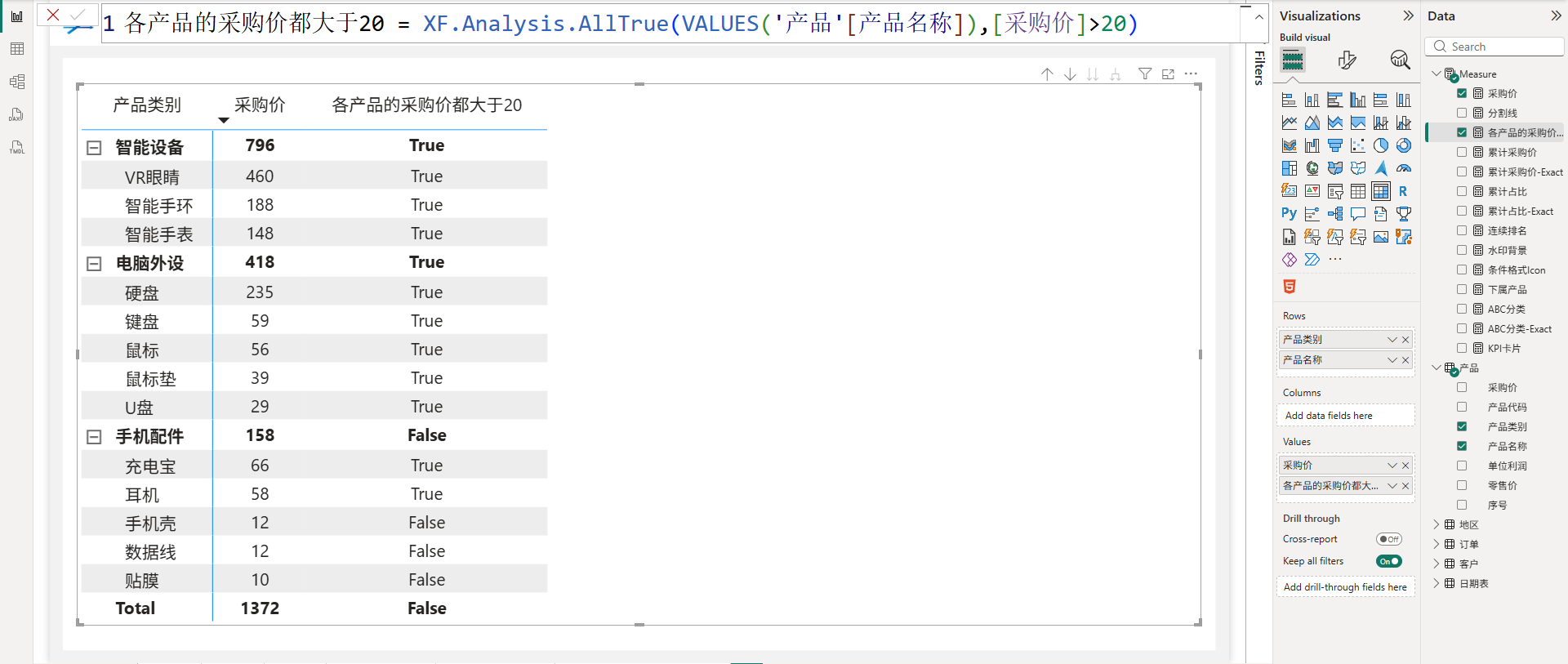 XF.Analysis.AllTrue(VALUES('产品'[产品名称]),[采购价]>20)