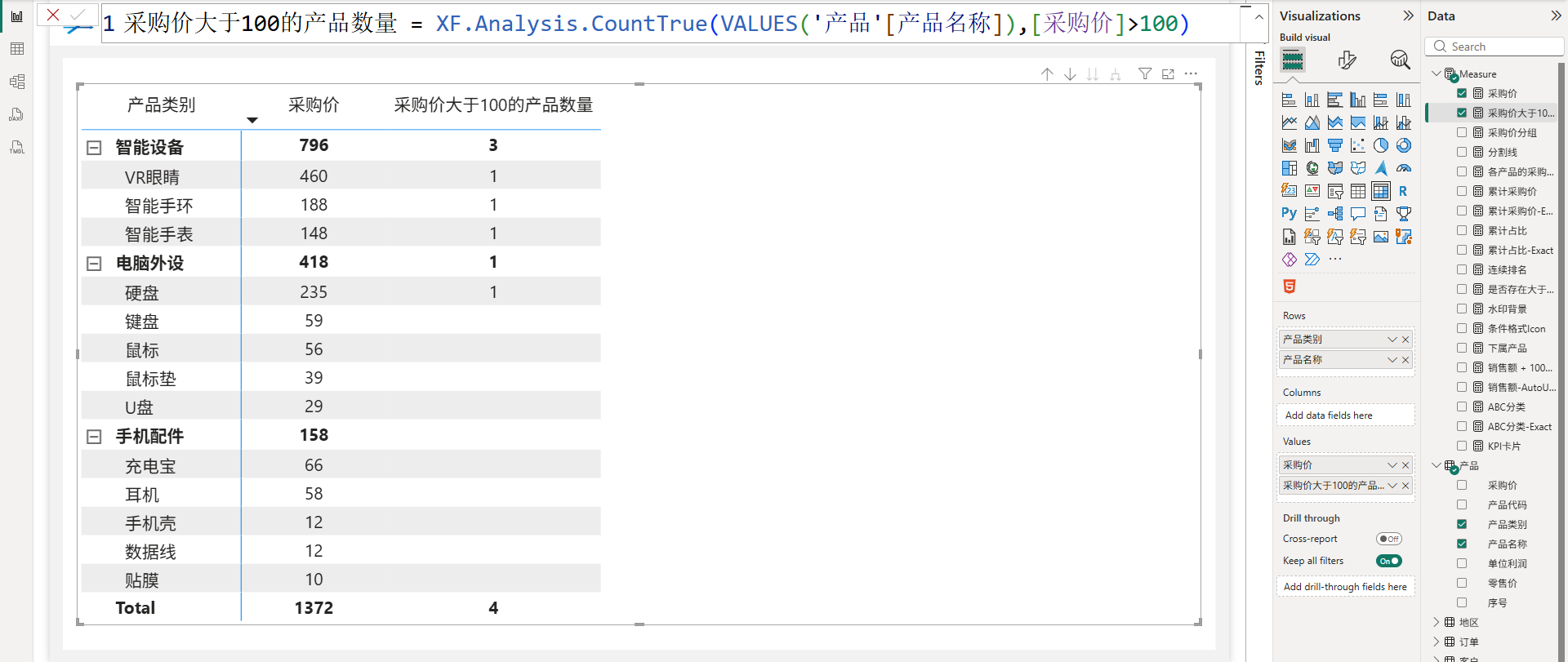 XF.Analysis.CountTrue(VALUES('产品'[产品名称]),[采购价]>100)