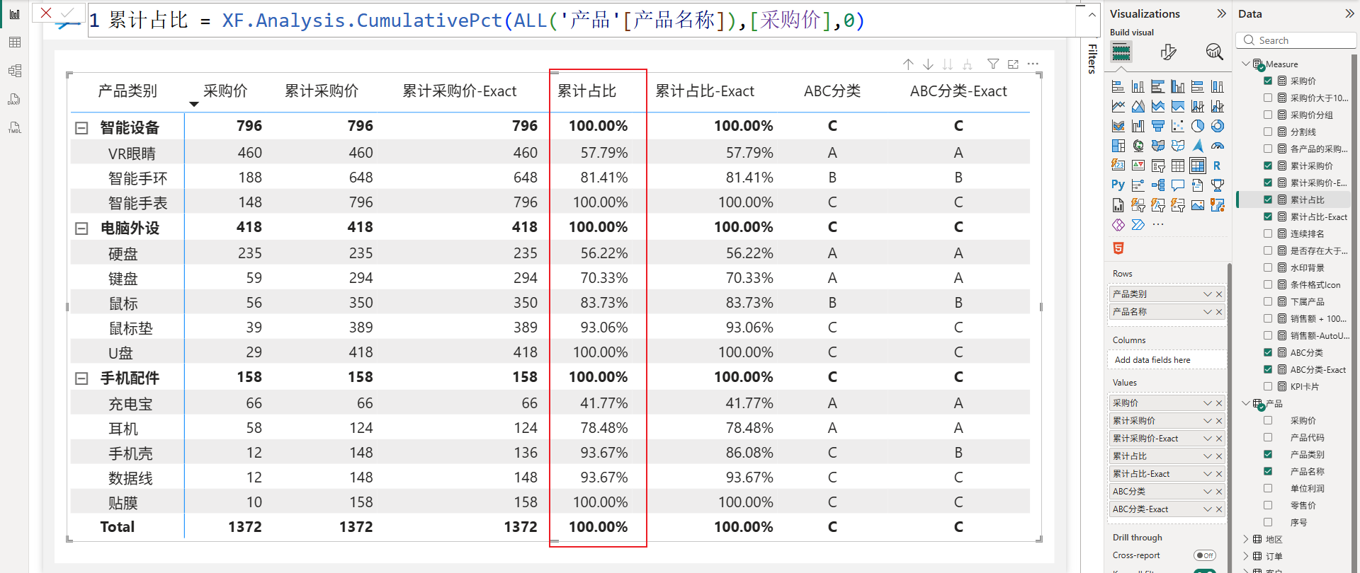 XF.Analysis.CumulativePct(ALL('产品'[产品名称]),[采购价],0)