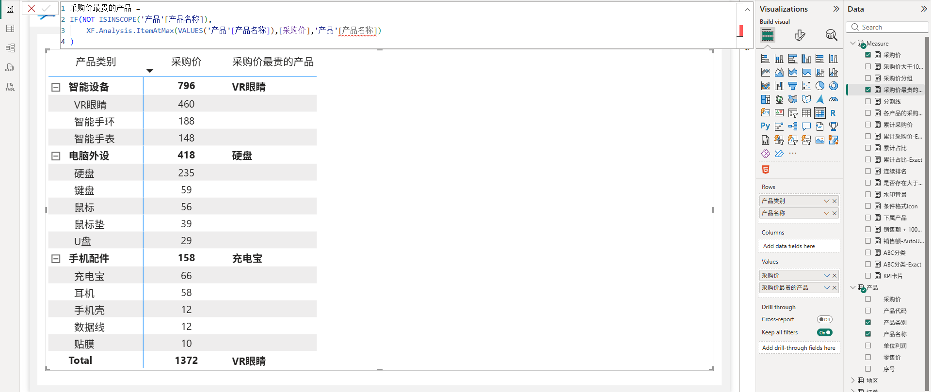 XF.Analysis.ItemAtMax(VALUES('产品'[产品名称]),[采购价],'产品'[产品名称])