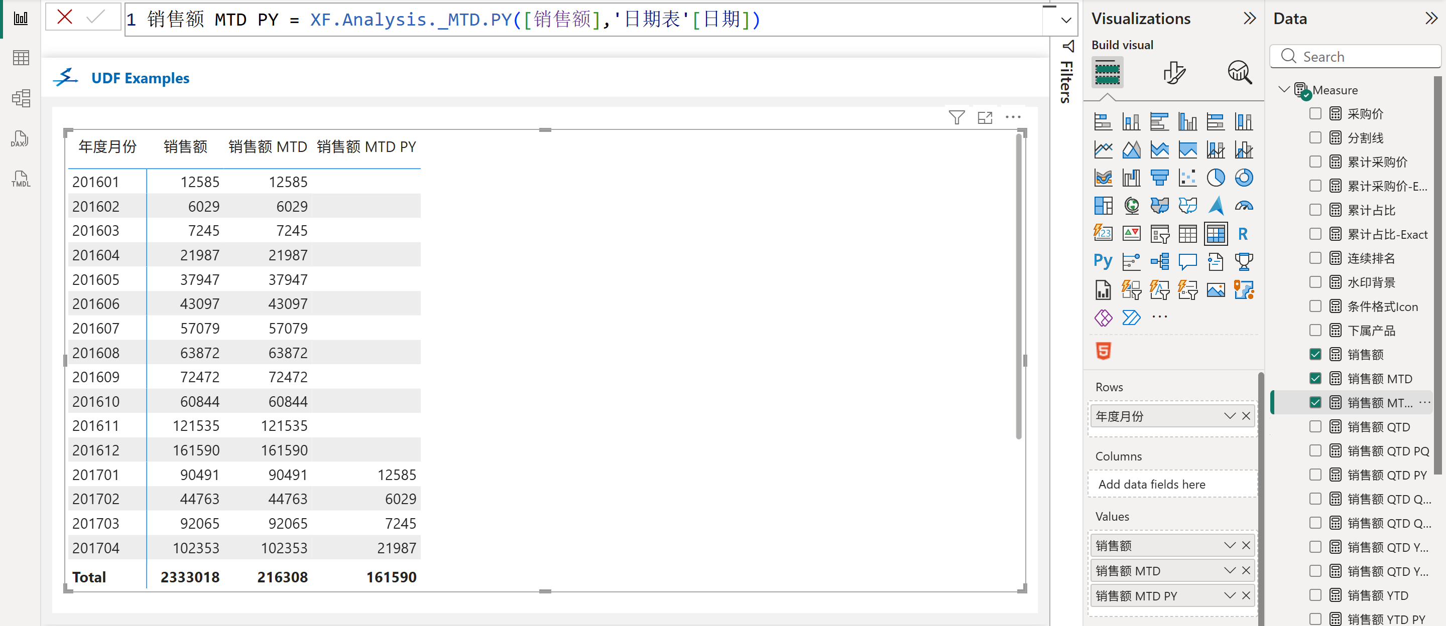 XF.Analysis._MTD.PY([销售额],'日期表'[日期])