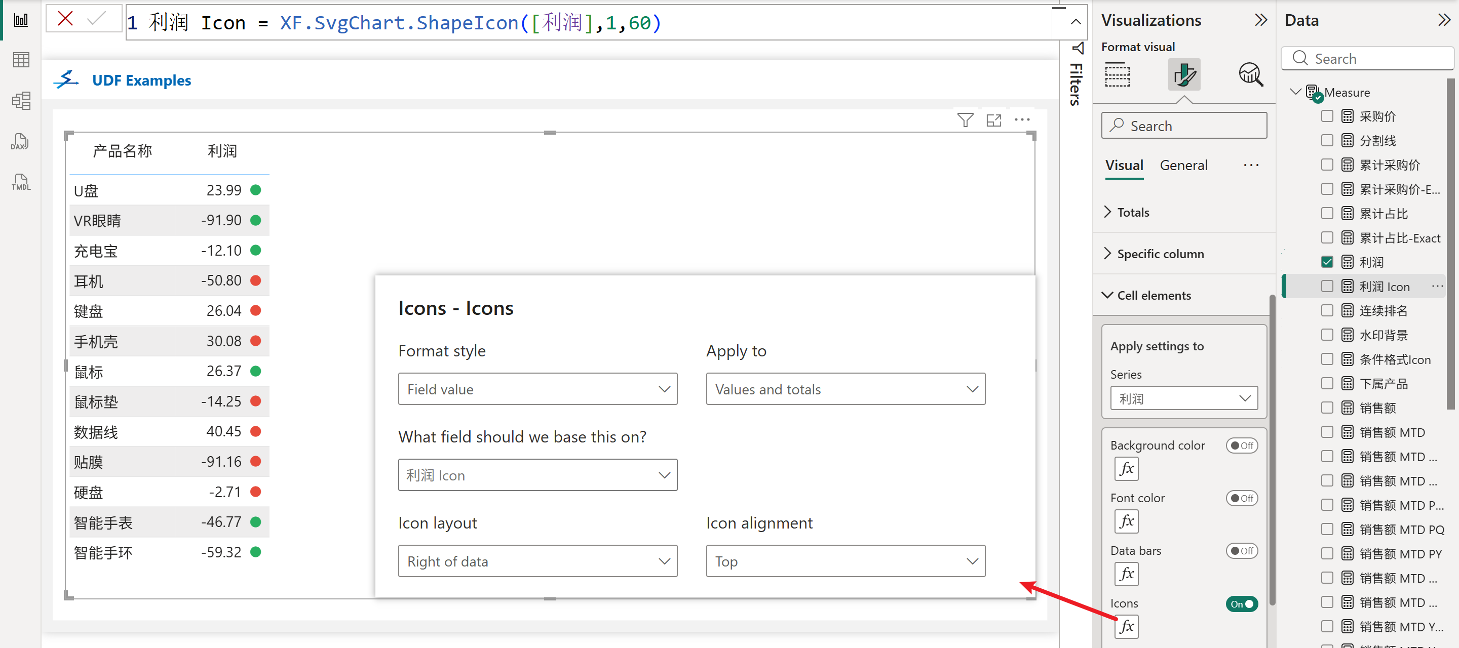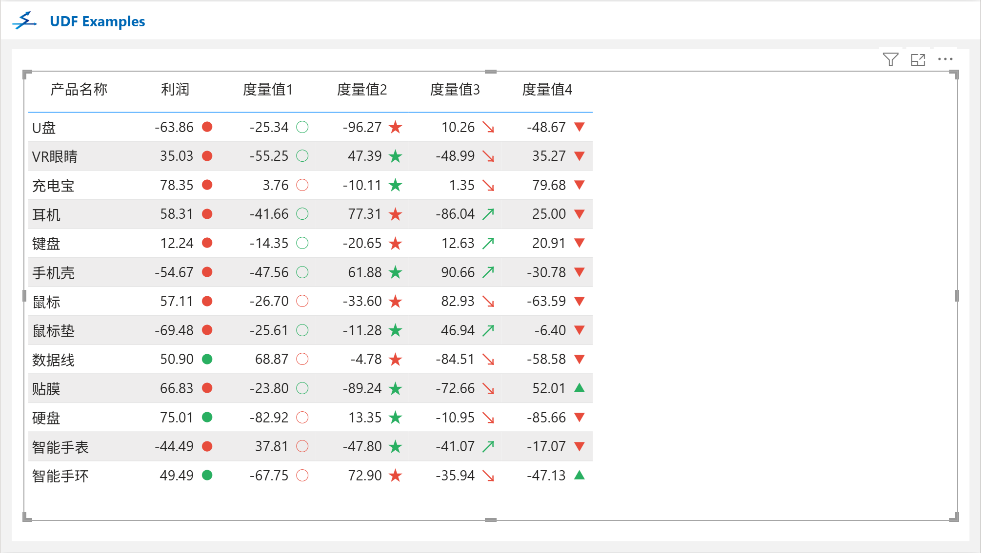 根据expression参数的值的正负返回不同的上升或下降Icon,可用在矩阵/表格的条件格式图标中。