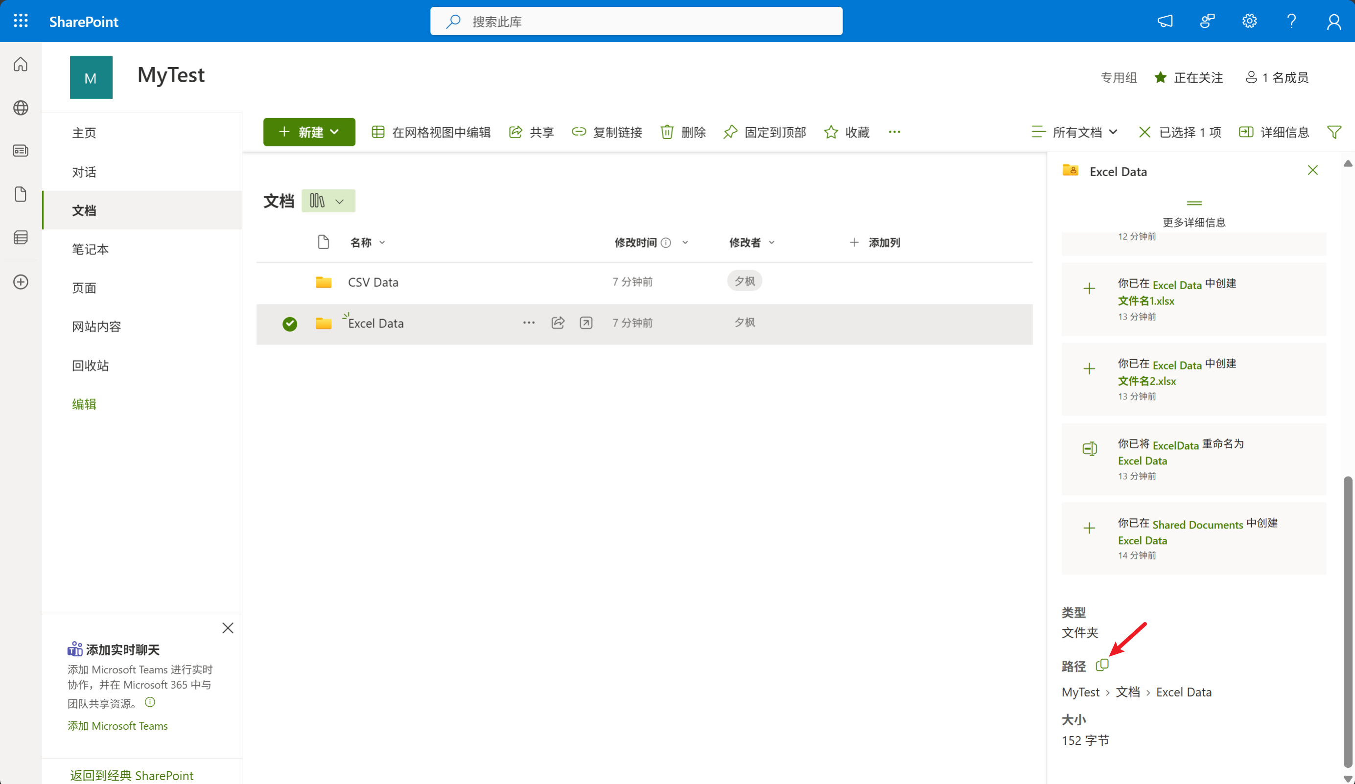 最后,再把文档替换成英文,即:Shared Documents,再把分隔符改为斜杠或反斜杠即可得到完整路径。如上图所示的Excel文件的完整路径应该为:Shared Documents/TestFolder/文件名1.xlsx